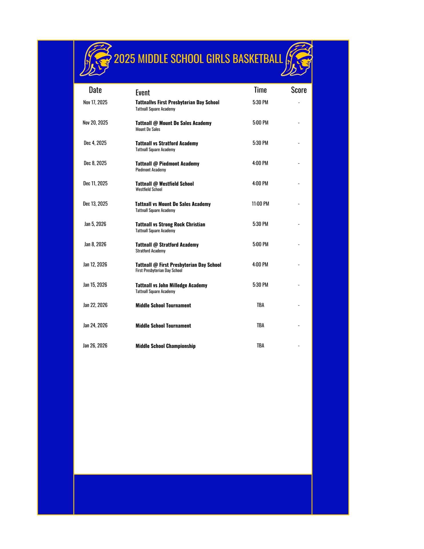 MIDDLE SCHOOL GIRLS BASKETBALL SCHEDULE
