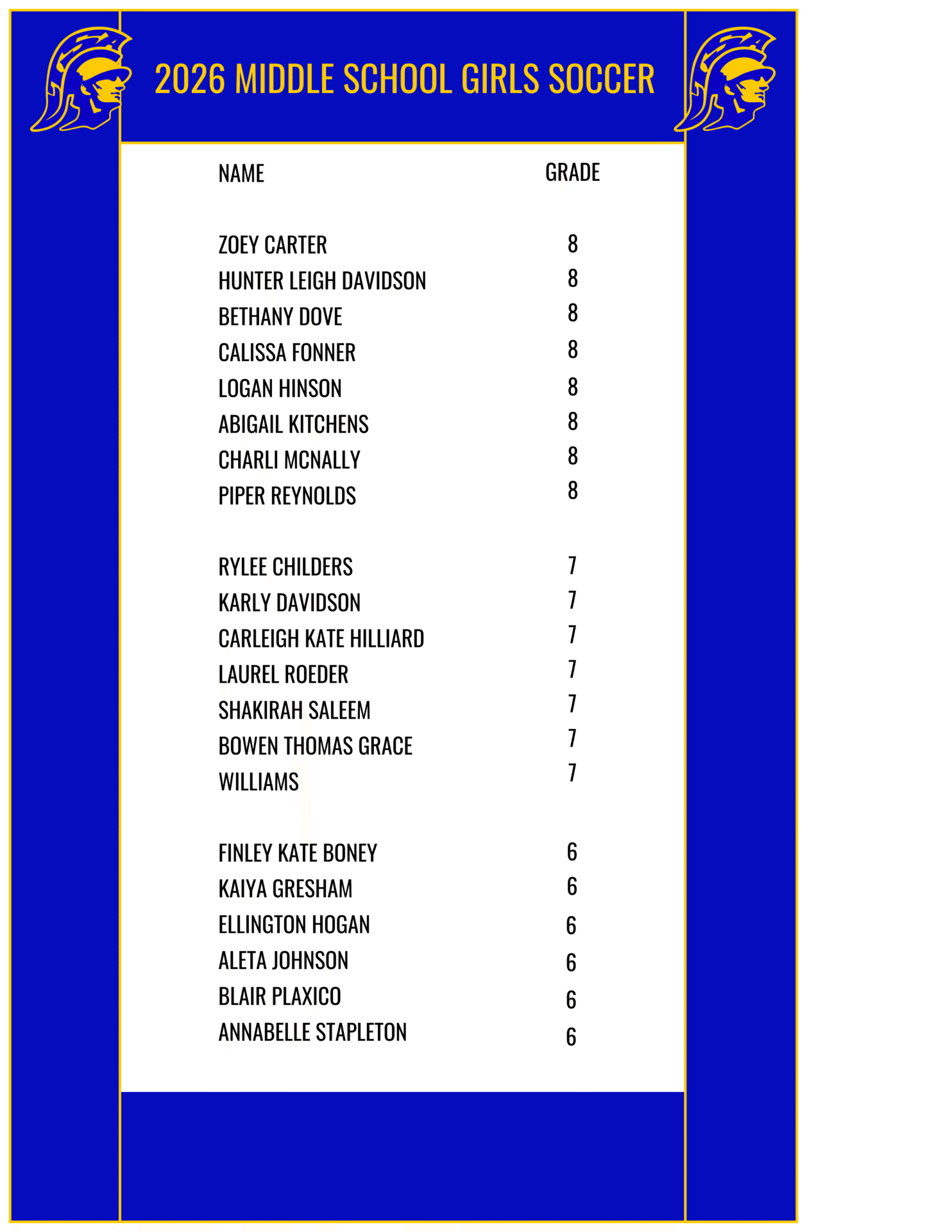 Middle School Girls Soccer Roster