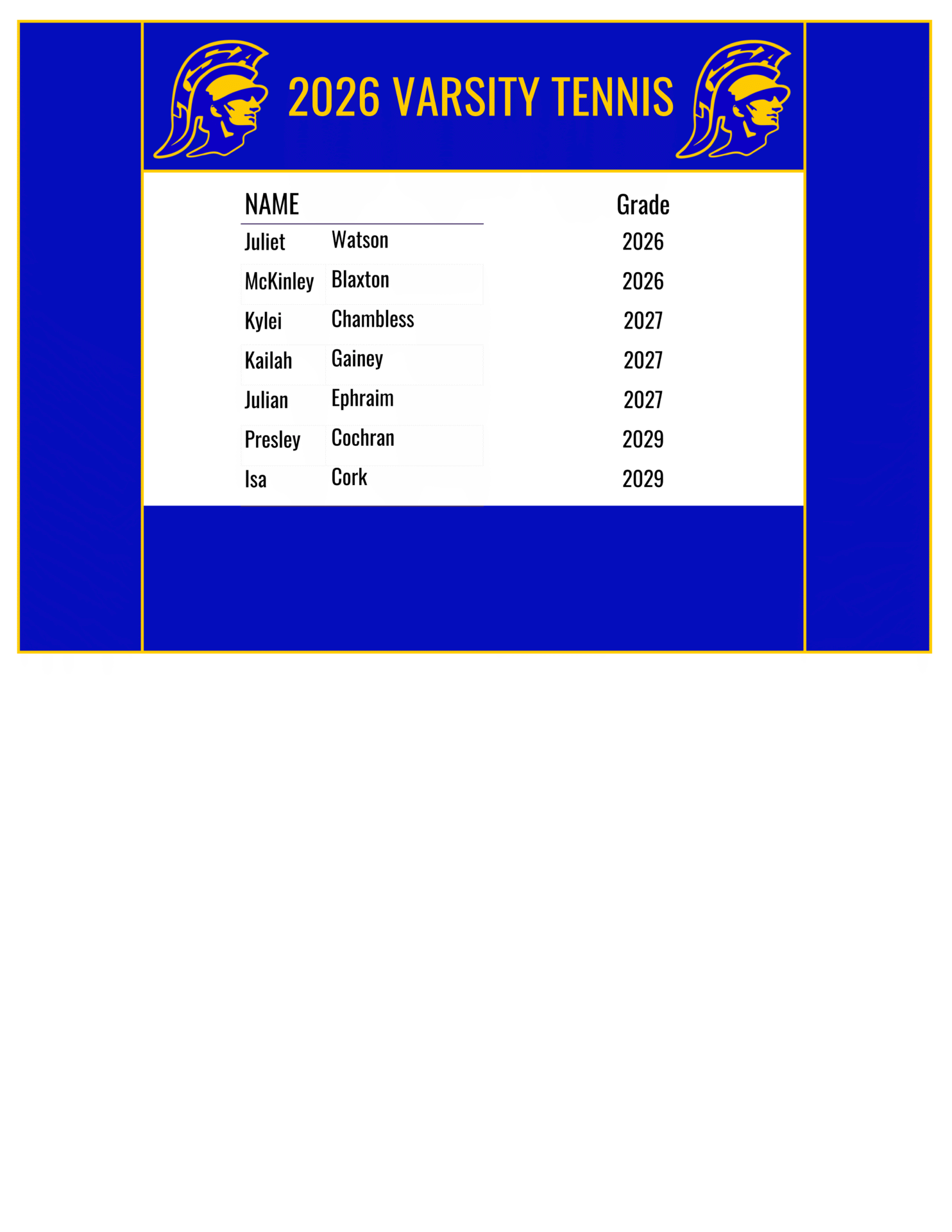 Varsity Tennis Roster